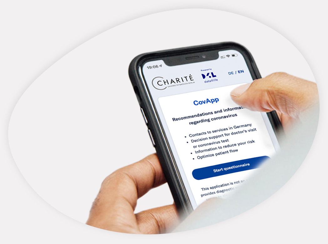 In order to provide people with guidance to better assess their symptoms and derive necessary actions, at the beginning of the COVID-19 pandemic in spring 2020, Charité - Universitätsmedizin Berlin developed the CovApp in collaboration with Data4Life. The joint initiative was supported by the Robert Koch Institute (RKI), the German Federal Ministry of Health (BMG) and the German Federal Center for Health Education (BZgA). Data4Life was significantly involved in the project until June 2021.